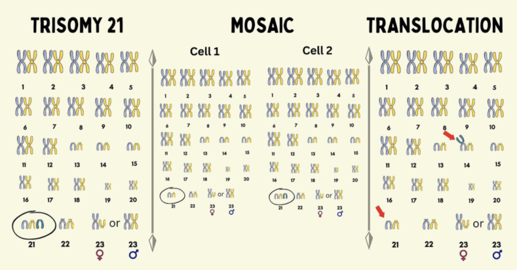 • Trisomy 21: This is the most common type of Down syndrome, making up 95% of cases. In this type, every cell in the body has an extra copy of chromosome 21.
