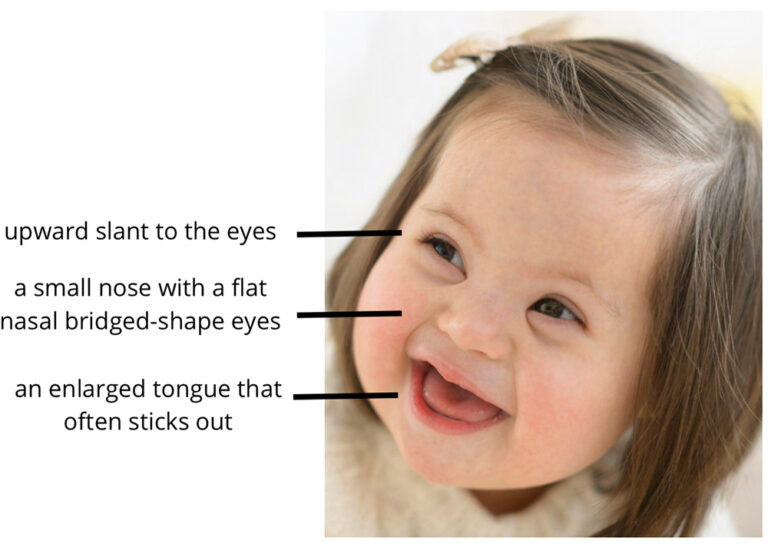This additional genetic material alters the course of development, resulting in common physical traits associated with Down syndrome, such as an upward slant to the eyes, a small nose with a flat nasal bridge, low muscle tone, an enlarged tongue that often sticks out, and a single deep crease across the palm. While most individuals with Down syndrome experience mild to moderate cognitive delays, each person is unique, and these traits may vary in degree or may not be present at all. Other characteristics may include hyperflexibility of joints and small, abnormally shaped ears.